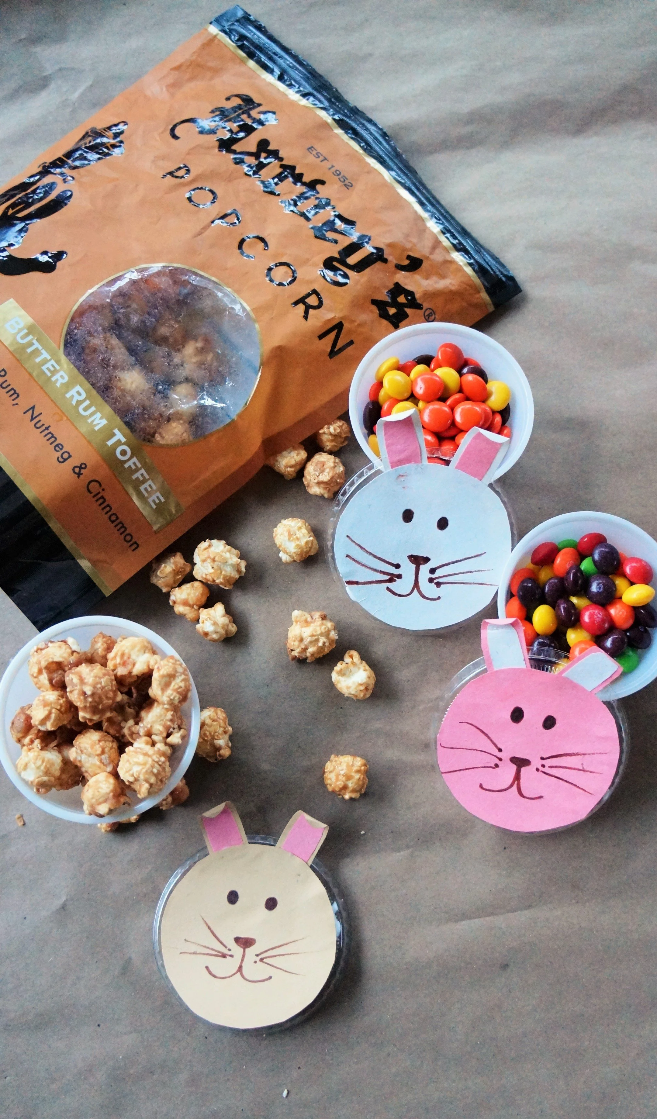 All you need are 3 - 4oz portion cups, small treats, and a few more supplies. Check out the bunny treat cups below and the yummy butter rum popcorn we discovered last week!