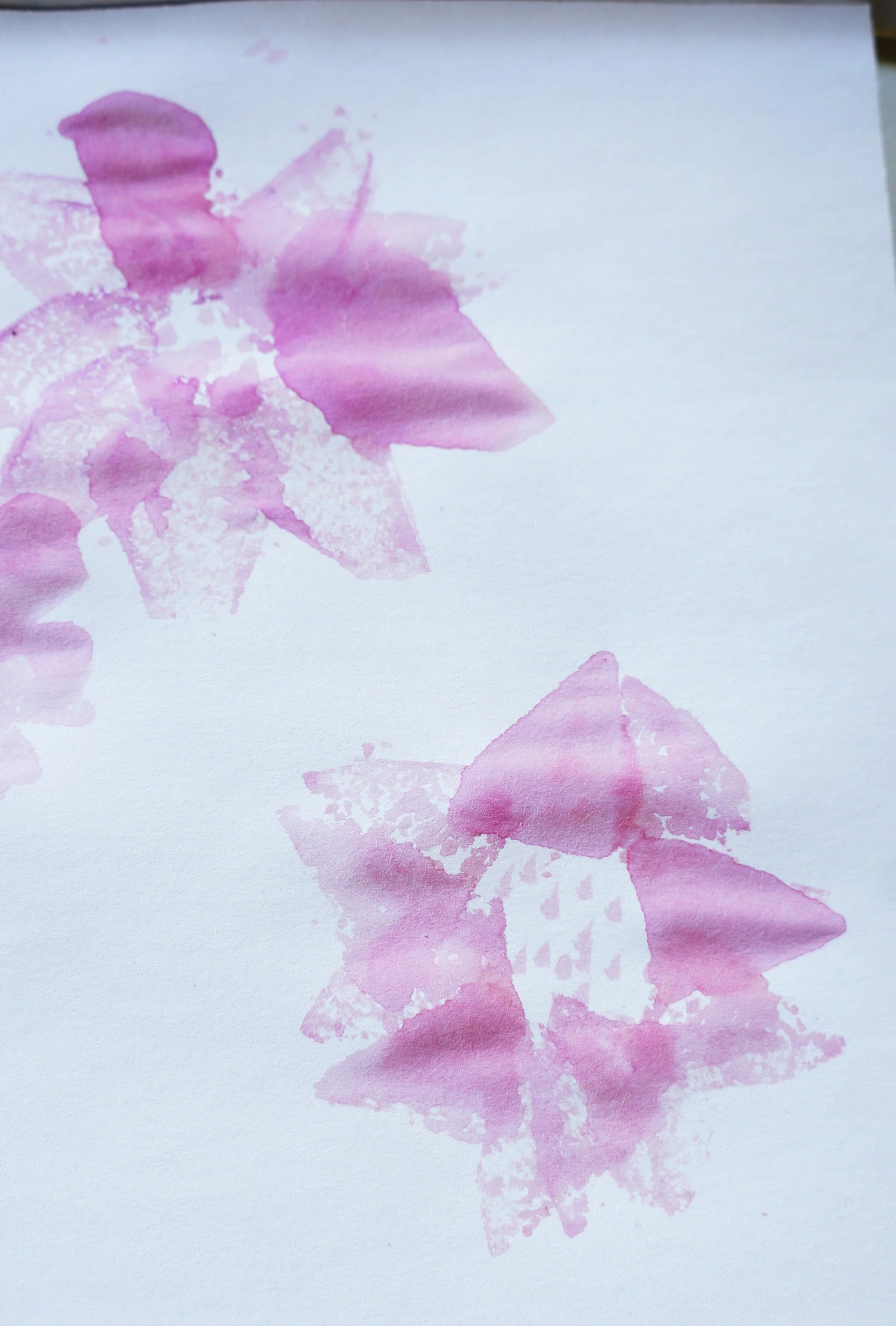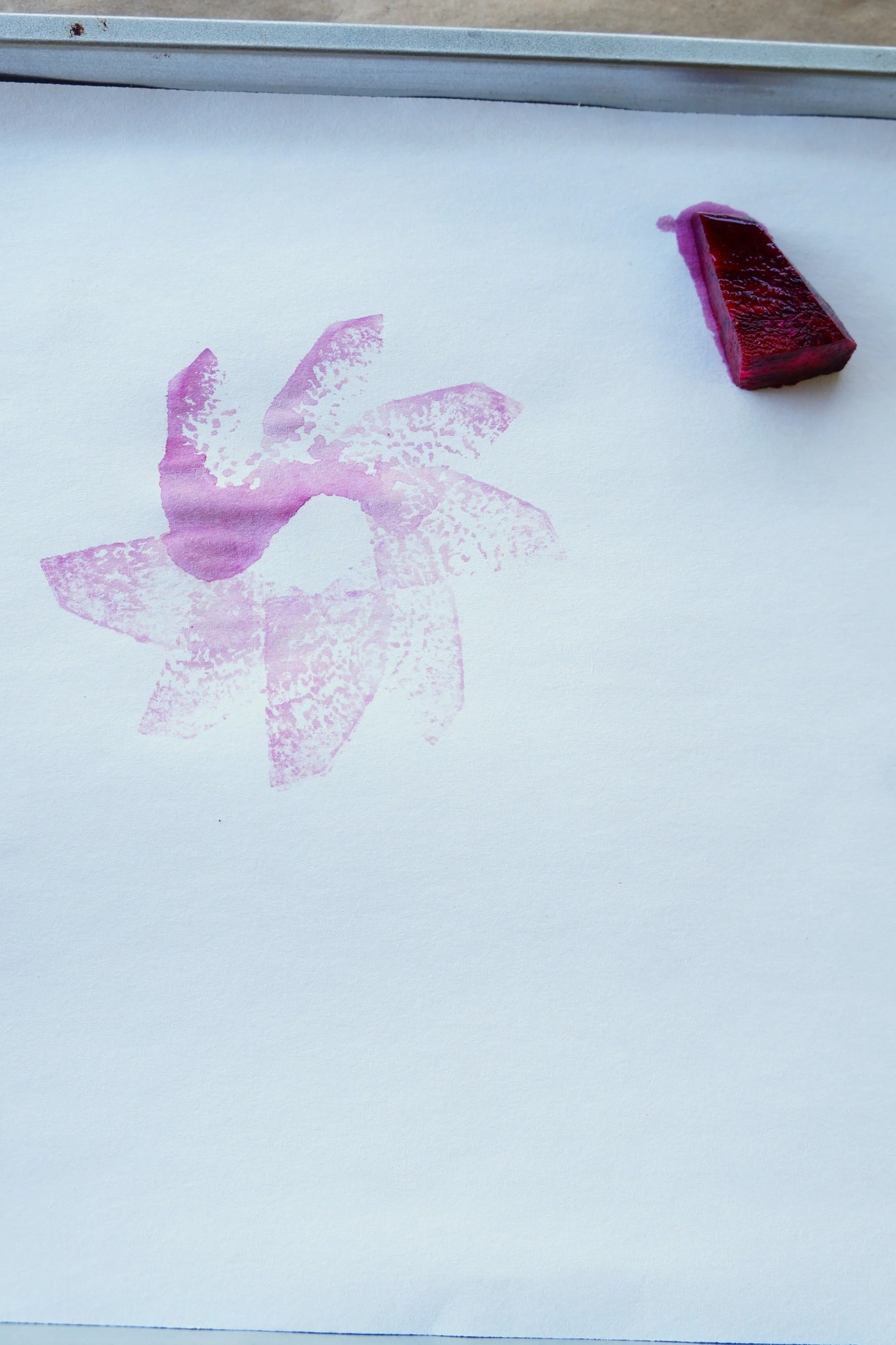 b) Stamp the beet, then flip it over and line it up with the straight edge of the first stamp, then press it down. Repeat in a circular shape. This creates large pointed petals.