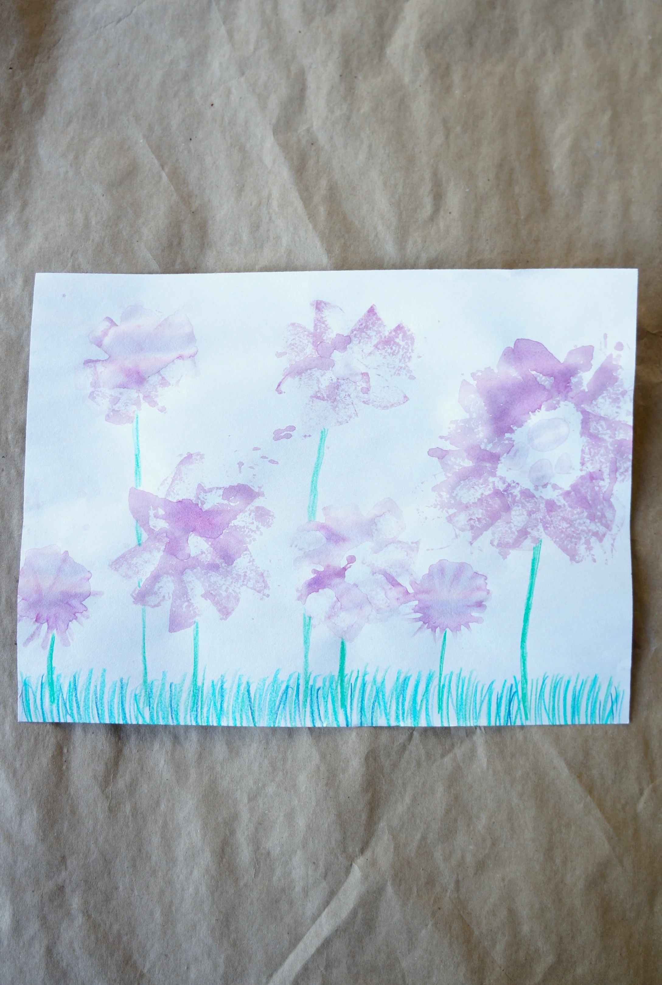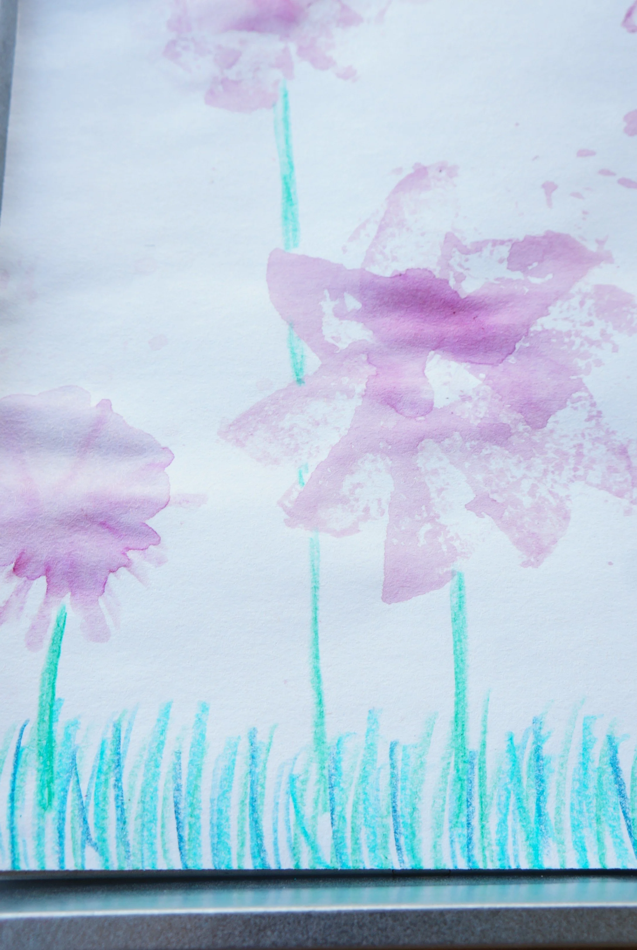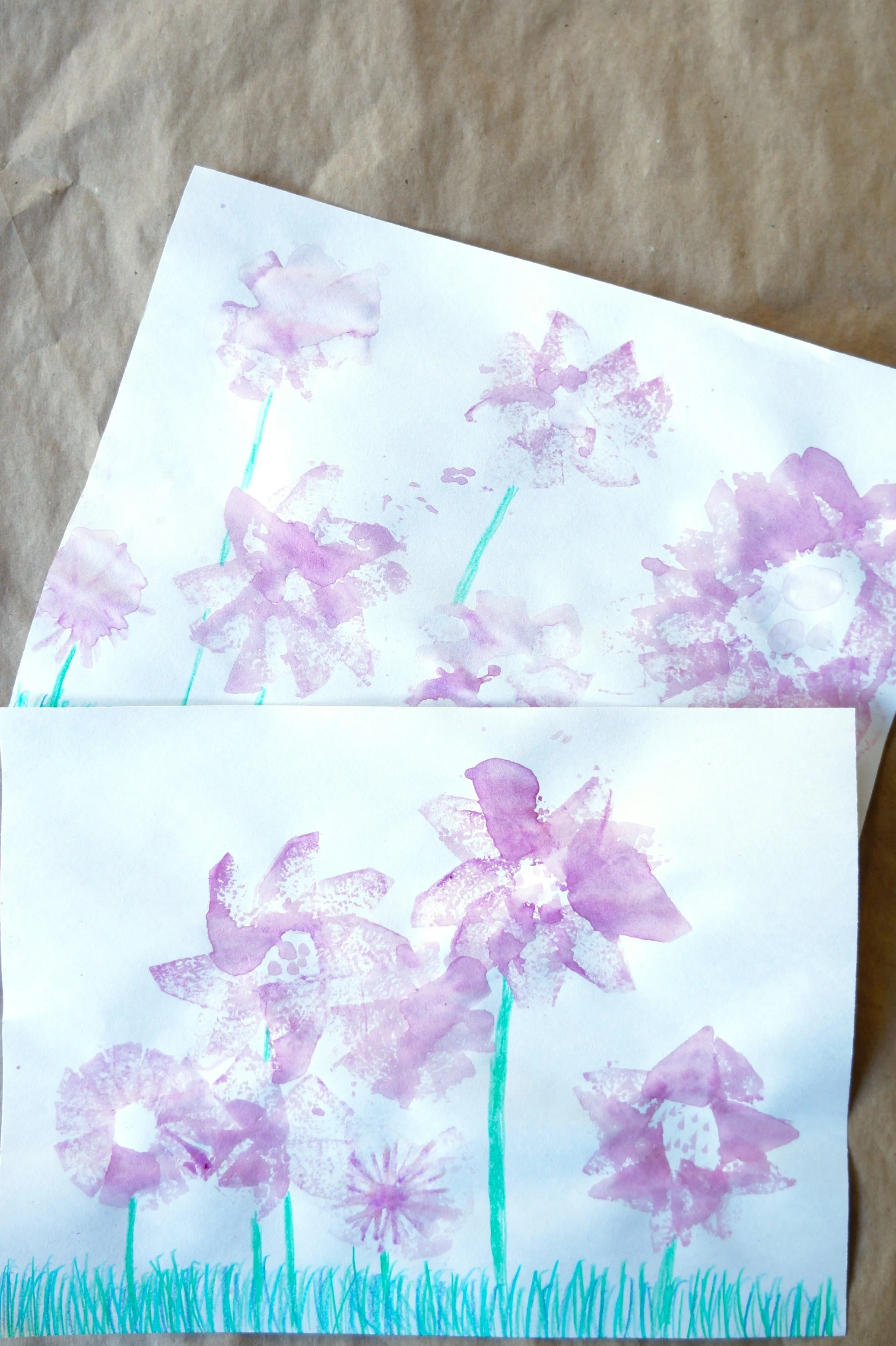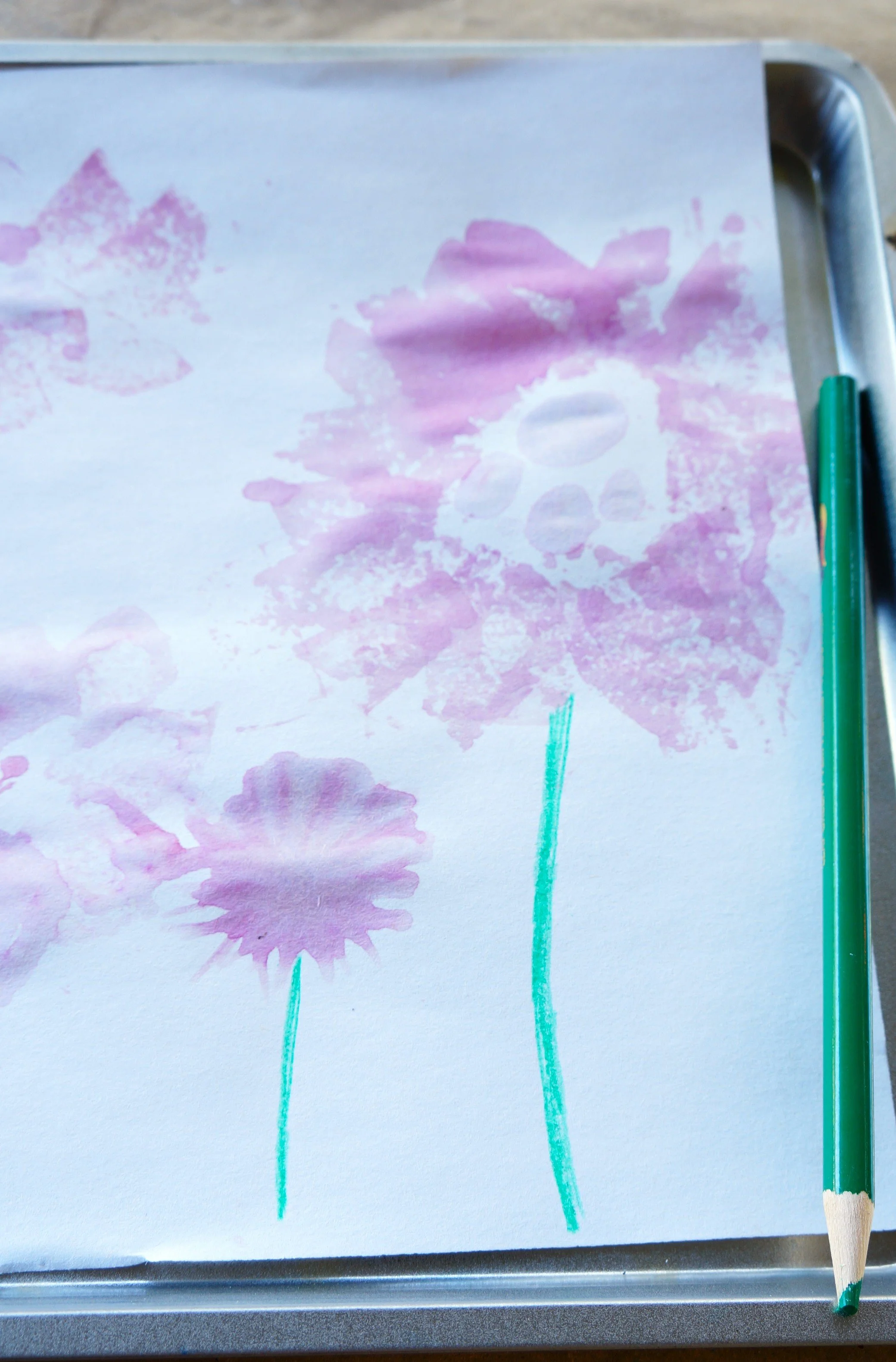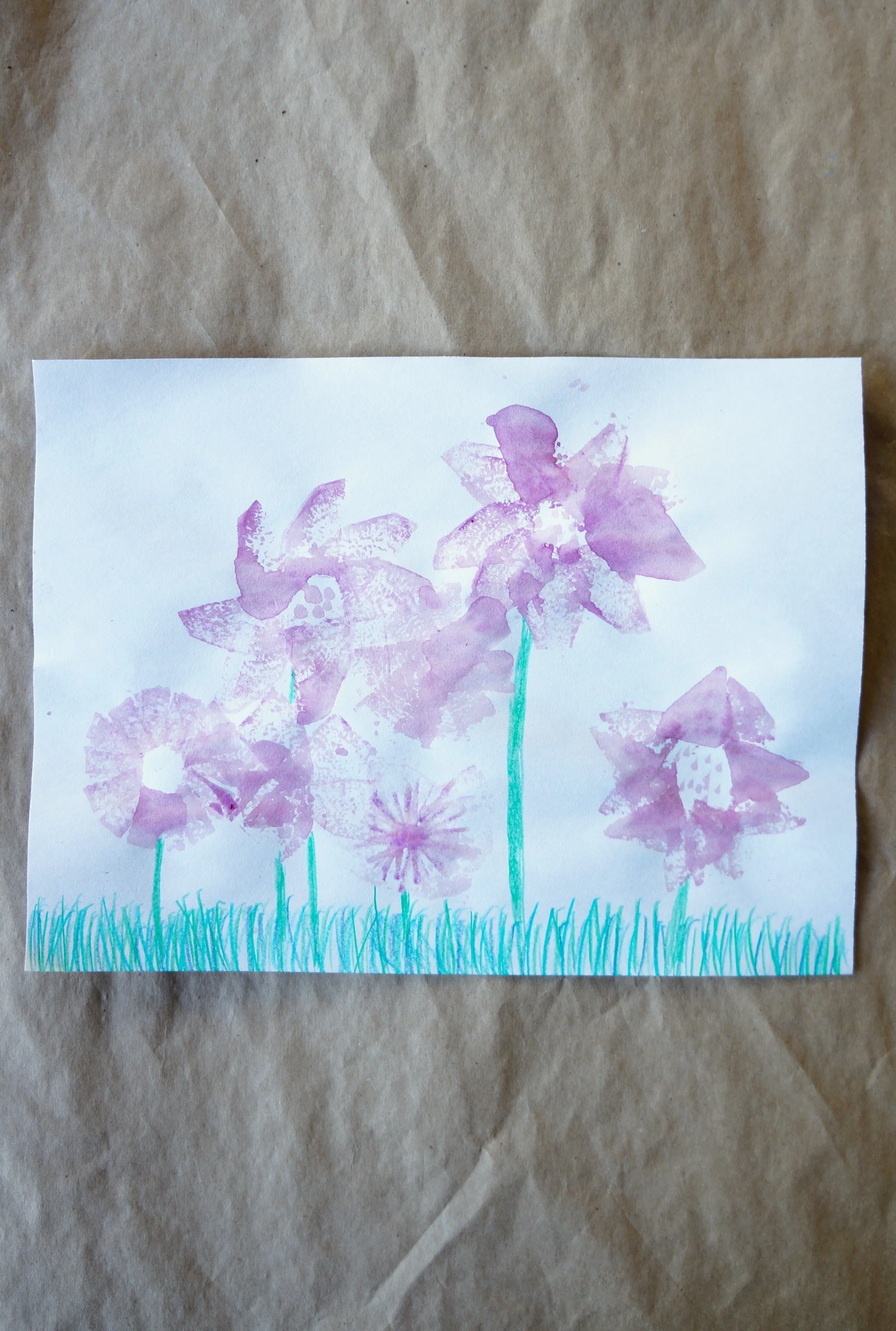 Use the colored pencils to create the flower stems and the pinwheel rods. We kept them all the same color.